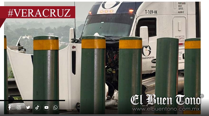 Carrillo Puerto.- Un tráiler de la empresa Transportes MG, chocó contra el muro de contención central, al circular sobre la autopista Córdoba-Veracruz, en el kilómetro 17, donde quedó varado.