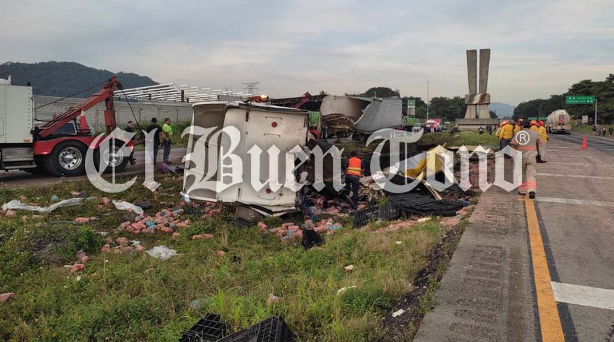 Amatlàn.- Un tráiler con caja refrigerante que transportaba embutidos chocó contra el Monumento de la Solidaridad y quedó como pérdida total, esto durante la mañana de este lunes en la autopista Córdoba-Veracruz, a la altura de Rancho Trejo. Lo aparatoso de este accidente generó la movilización de paramedicos de Caminos y Puentes Federales, así como del Grupo Samuv, que le brindaron los primeros auxilios al operador y lo trasladaron para su atención médica.