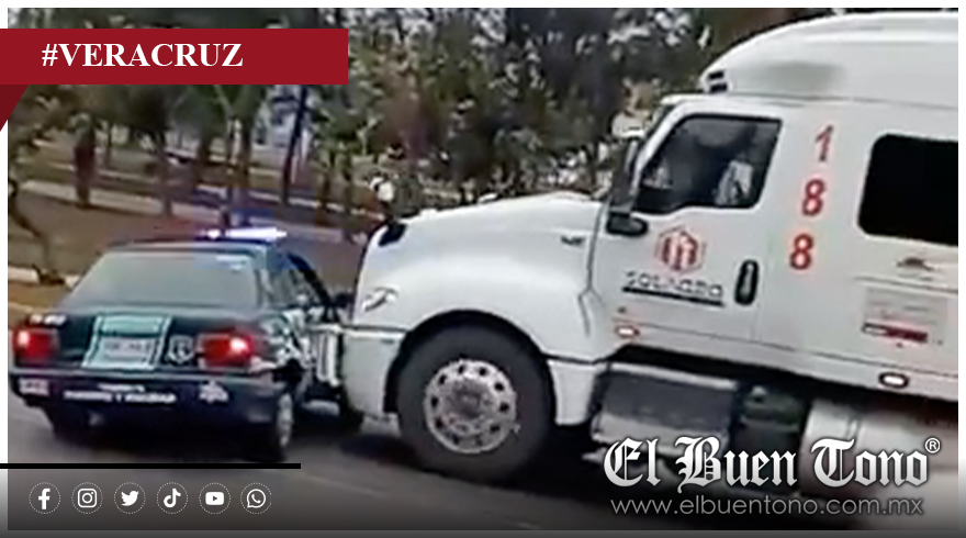 Veracruz.- La mañana de este miércoles, un tráiler de doble remolque impactó una patrulla de Tránsito marcada con el número TV-012 en el bulevar Fidel Velázquez, a la altura de la planta de tratamiento de Grupo MAS. A pesar de que el vehículo oficial fue arrastrado varios metros, no se reportaron personas lesionadas.