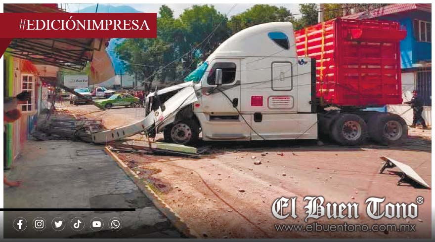 El vehículo, con número económico 52, provenía de Puebla y transportaba una plataforma con cajas vacías para pollo. Al notar una fila de autos detenidos, el conductor intentó frenar sin éxito. En su esfuerzo por evitar una colisión, se desvió hacia la banqueta, derribando cinco postes de servicios públicos.