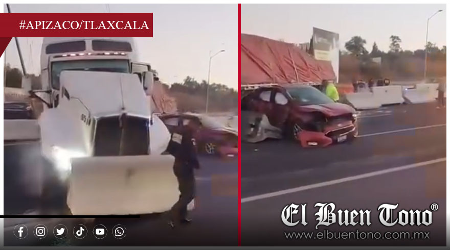 Apizaco/Tlaxcala.- Un tráiler que circulaba presuntamente a exceso de velocidad provocó un fuerte choque múltiple al embestir varios vehículos y terminar impactado contra los muros de contención en la zona conocida como El Molinito, sobre la carretera Apizaco–Tlaxcala.