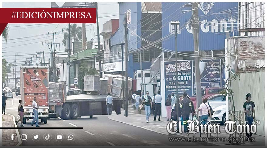 Orizaba.— Una maniobra deficiente realizada por el conductor de un tractocamión provocó un severo cierre vial y congestionamiento este viernes por la tarde sobre la calle Poniente 7, entre Sur 18 y Sur 20, con dirección hacia Río Blanco. La pesada unidad quedó atravesada al intentar ingresar a un establecimiento comercial.