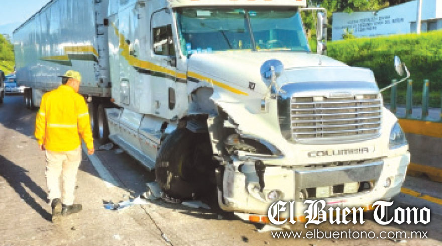 Metros antes de llegar a la caseta de cobro de Fortín de las Flores un tractocamión marca Freightliner color blanco, con matrícula 670-EU-8 del SPF, que iba remolcando una caja seca le dio el «cerrón» y colisionaron de costado.