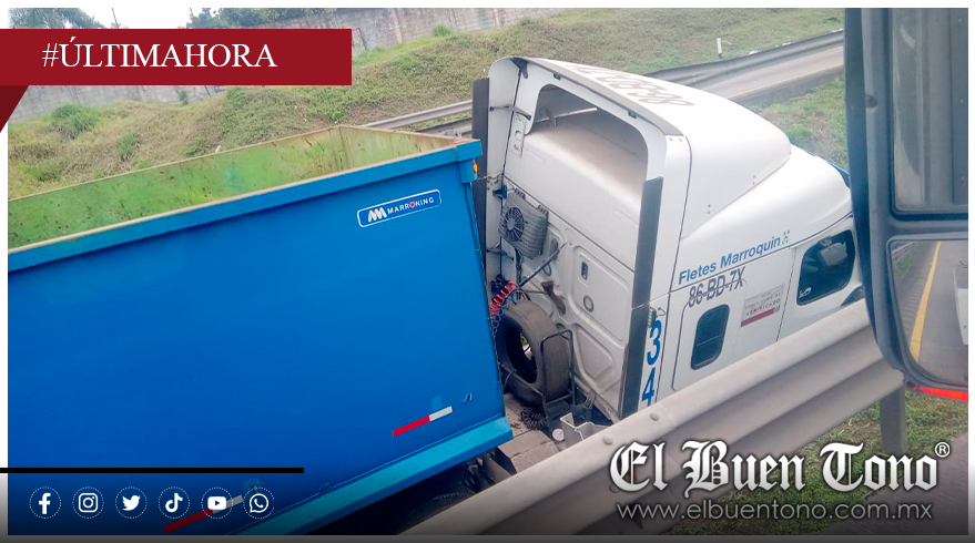 Fortín, Ver.– Un tractocamión con doble remolque, perteneciente a la empresa Fletes Marroquín, se salió del camino y terminó en el camellón central la mañana de este martes, sobre la autopista Orizaba–Córdoba, a la altura del kilómetro 288.