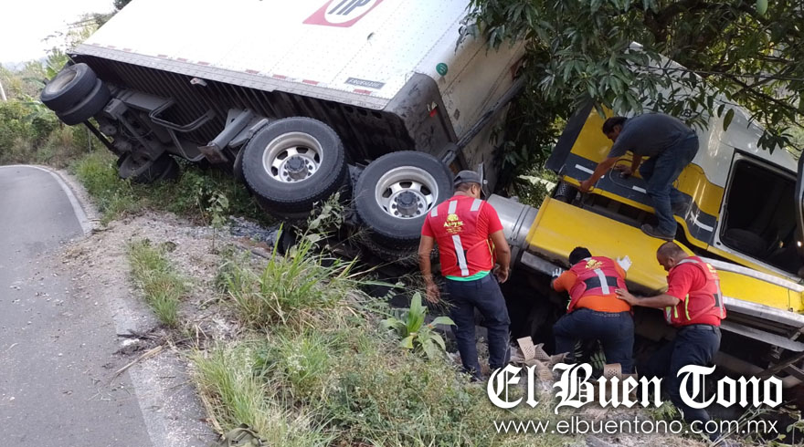 Atoyac.- Un tractocamión, propiedad de la empresa de autotransportes Trabal, volcó la mañana de ayer, luego de que su conductor identificado como Jorge Estefani Alvarado, perdió el control del volante, tras ser “sacado” del camino por otro vehículo que se dio a la fuga.