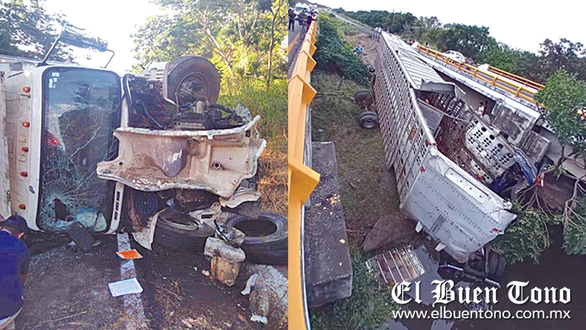 La Tinaja.- El operador de un tráiler, cargado con ganado, perdió la vida luego de que la unidad se volcó y terminó en medio de un puente, al momento de circular sobre la autopista La Tinaja-Cosamaloapan, a la altura del kilómetro 60, teniendo que arribar diferentes grupos de auxilio así como elementos de la Guardia Nacional y autoridades de la Fiscalía Regional, quienes tomaron conocimiento del deceso.