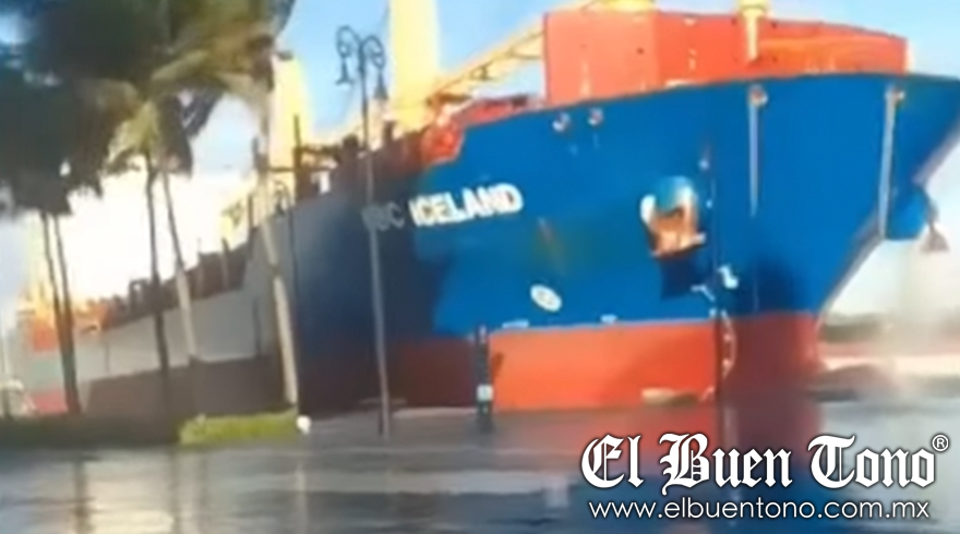 Veracruz.- Esta mañana, alrededor de las 9:00 AM, un barco mercante impactó contra el malecón de Veracruz debido a un accidente con las cuerdas de la proa, que se reventaron y dejaron a la embarcación sin amarre.