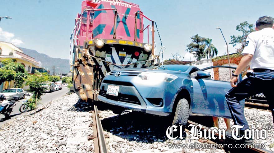 El auto, con placas del Estado de México NDS4504, conducido por un joven, quien ignoró los señalamientos preventivos y cruzó la vía, lo que causó que fuera impactado y arrastrado.