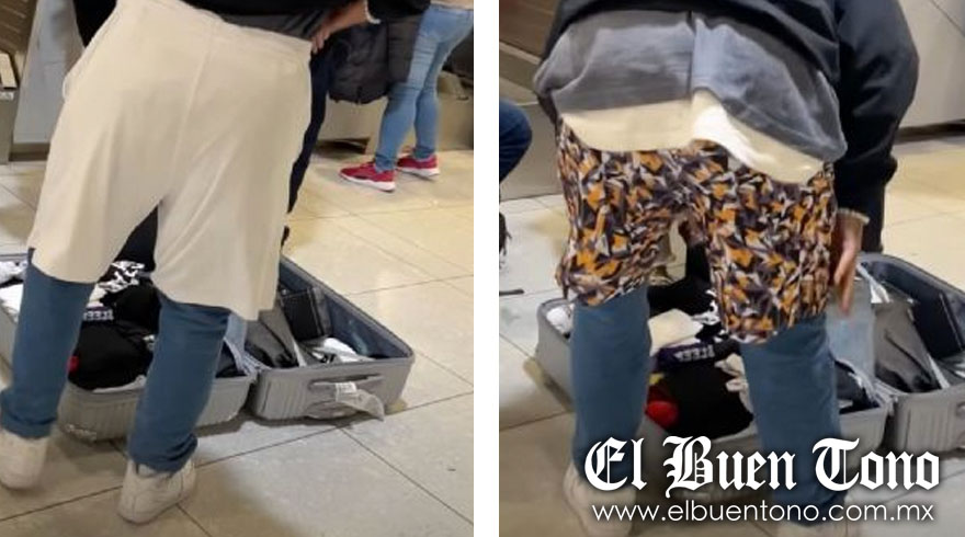 Vestido con un short encima de unos pantalones, con dos playeras y una sudadera, el hombre continúa viendo qué ponerse para poder ingresar al avión sin salirse del presupuesto.