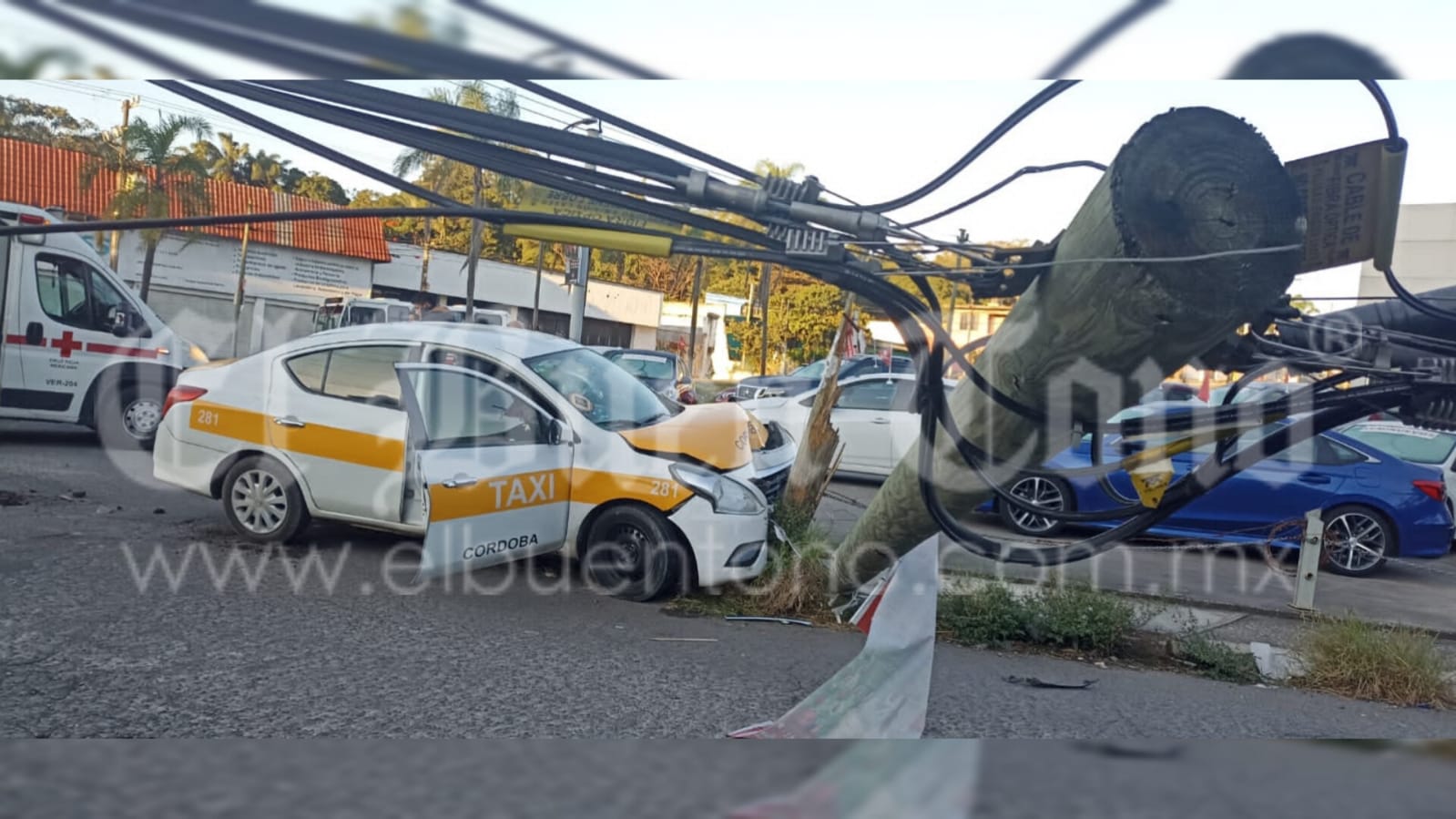 Córdoba, Ver.- El taxi 281 chocó y derribó un poste de telefonía esta mañana de lunes en la entrada del camino a Cuauhtémoc, a unos metros del boulevard Córdoba – Peñuela, sin que se registraran personas lesionadas, sólo daños materiales y el cierre momentáneo de la circulación.