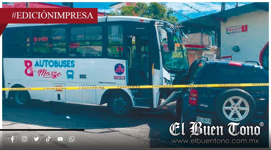 El impacto del autobús provocó que la camioneta fuera proyectada hasta la banqueta, sufriendo daños considerables en su lado izquierdo.