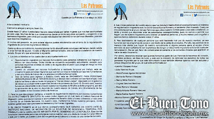 Amatlán.- La agrupación de “Las Patronas”, conocidas por brindar ayuda a migrantes que viajan en el tren conocido como “la bestia”, emitieron un comunicado para alertar a la ciudadanía sobre un grupo de personas desconocidas que lucran con su nombre.