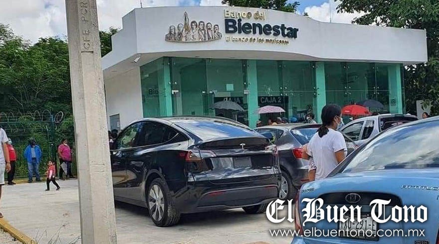 A través de un grupo de Facebook, fue compartida la fotografía en la que se ve un vehículo Tesla Modelo X de color negro sin placa valuado en 3 millones de pesos, en el estacionamiento del Banco del Bienestar. De fondo se observa la larga fila de beneficiarios del programa que acudieron a cobrar su pensión.