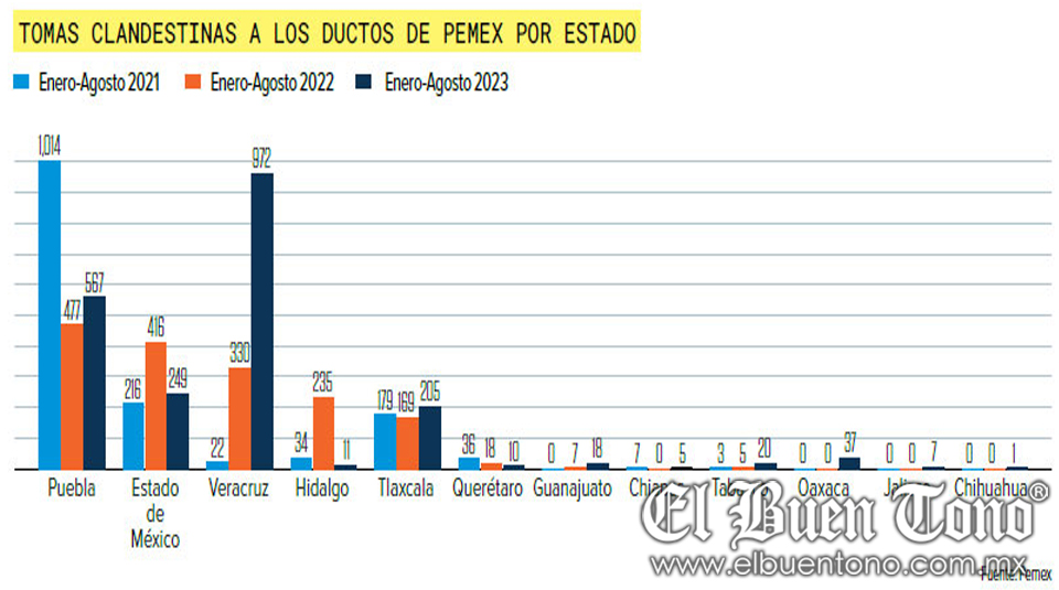 Según datos proporcionados por Pemex, entre enero y agosto de este año, se han detectado 2 mil 102 tomas clandestinas, lo que representa un aumento del 27% en comparación con el mismo período de 2022. Estas tomas clandestinas se han encontrado principalmente en los estados de Veracruz, Puebla, Estado de México, Tlaxcala, Hidalgo, entre otros.