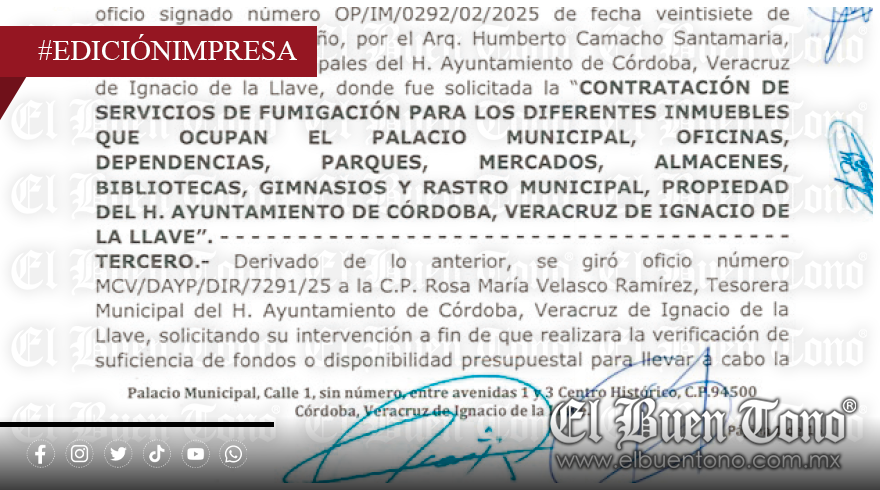 Córdoba.- El Ayuntamiento de Córdoba adjudicó de manera directa un contrato por 400 mil pesos a una proveedora originaria de Puebla para servicios de fumigación en sus inmuebles, bajo el argumento de una “excepción de ley”.