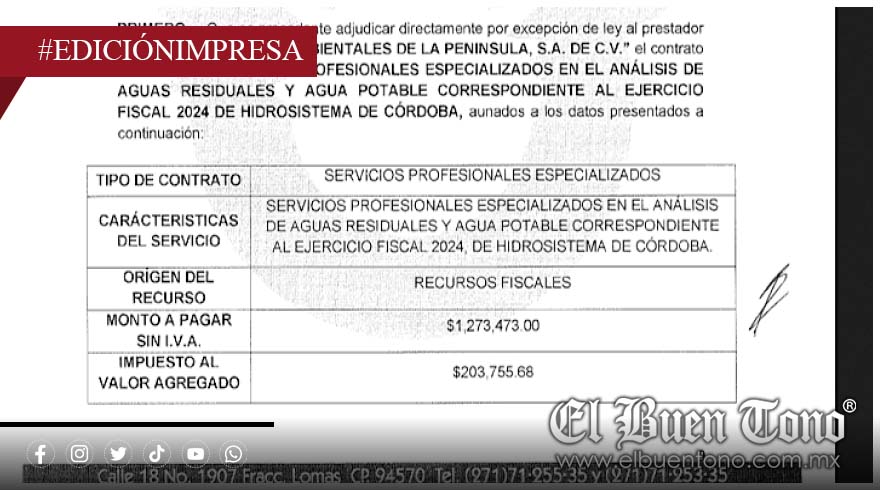 Córdoba.- En medio de cuestionamientos por el evidente abandono de sus plantas de tratamiento de aguas residuales, Hidrosistema de Córdoba adjudicó directamente a una empresa externa un contrato por 1.4 millones de pesos para realizar análisis de agua potable.