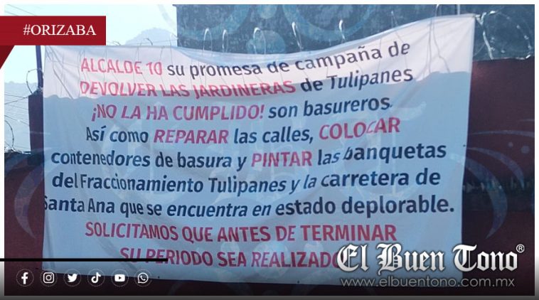 En la carretera a Santana, colindante con la avenida Tulipanes, los vecinos colocaron una lona en la que exigen que antes de dejar el cargo cumpla con los compromisos adquiridos hace casi cuatro años.