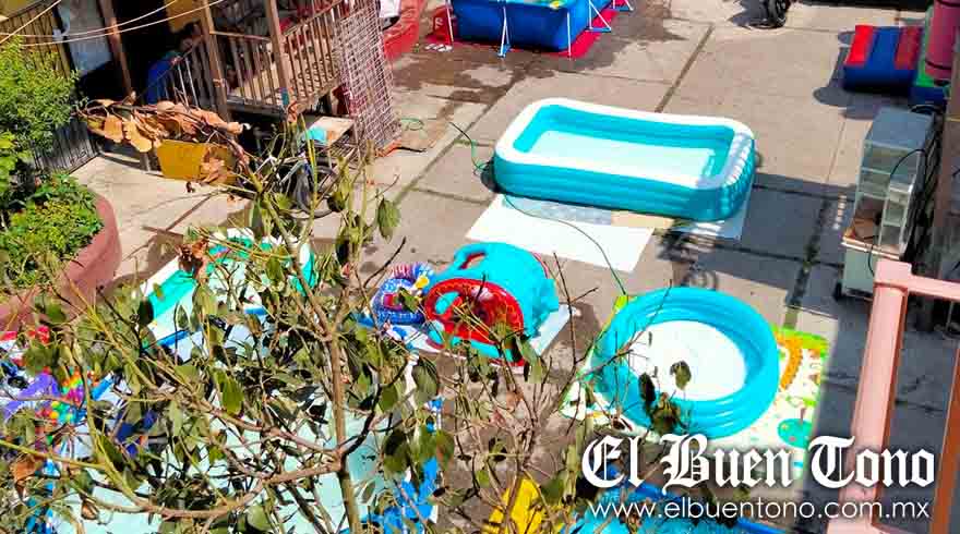 A raíz de la intensa ola de calor que azota a la capital y el país en general, un grupo de vecinos de una unidad habitacional en Tepito se organizaron para improvisar un parque acuático.