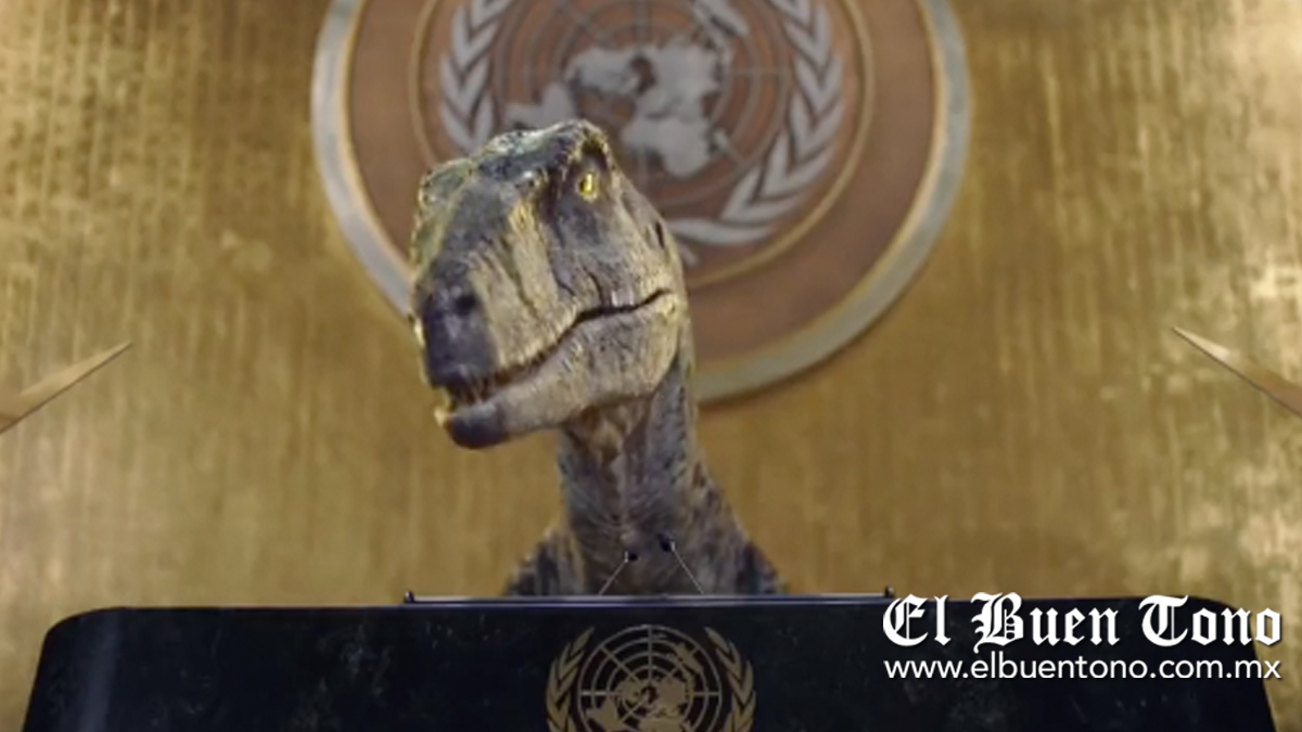 Durante el hemiciclo de la Asamblea General de la Organización de las Naciones Unidas, un dinosaurio exhortó a los líderes mundiales a abandonar las subvenciones a los combustibles fósiles y a no elegir la extinción.