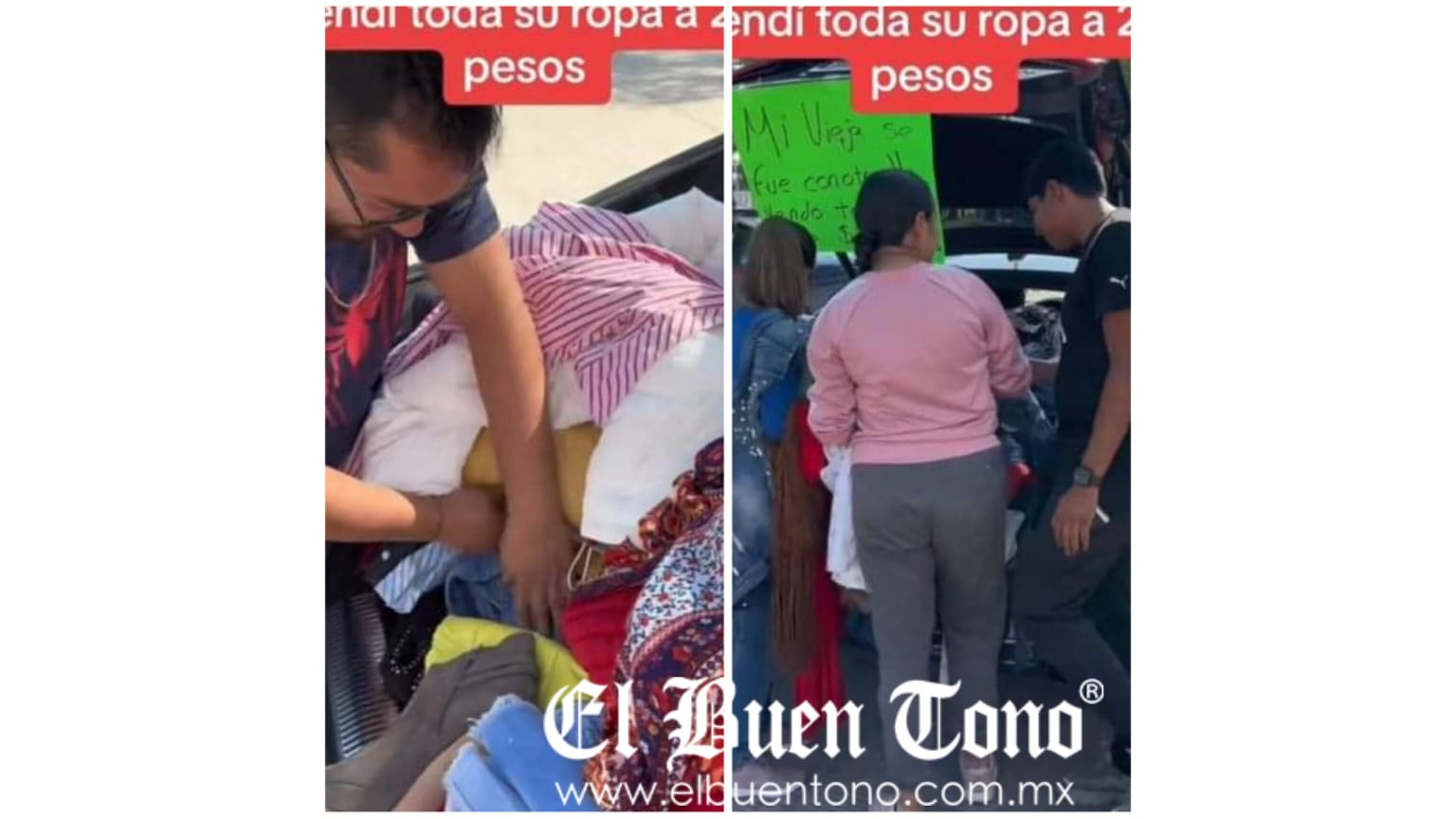 En las imágenes, se ve un automóvil gris estacionado en la calle con el maletero abierto, lleno de ropa. Desde faldas hasta camisas, blusas, pantalones y chalecos, aparentemente todas las prendas del guardarropa de su ex compañera estaban a la venta, con precios que oscilaban entre los 10 y 20 pesos.