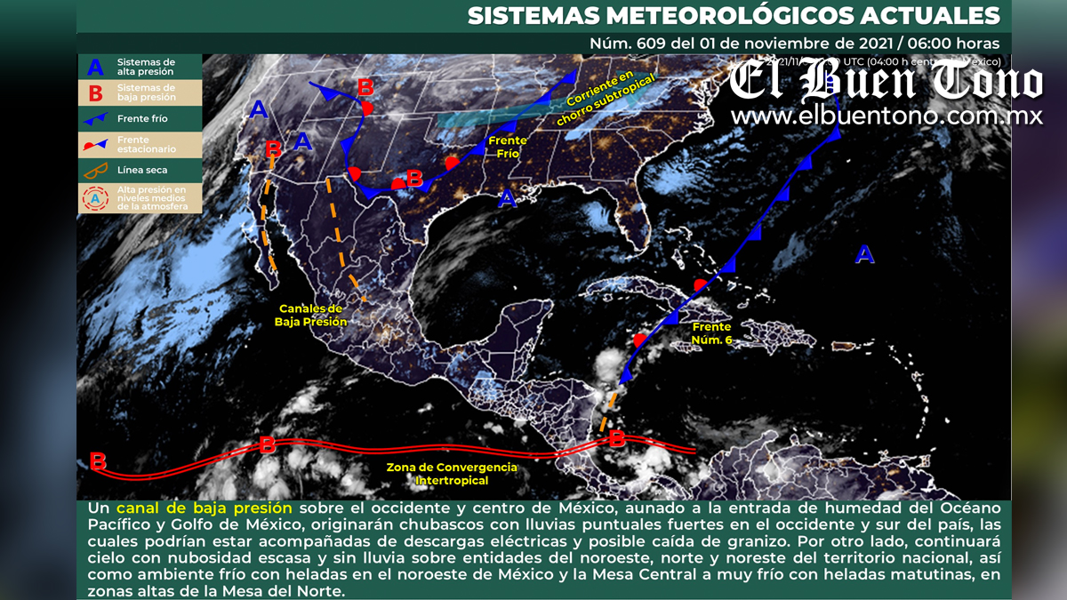 Para hoy, un canal de baja presión extendido sobre el occidente y centro de la República Mexicana, aunado a la entrada de humedad del Océano Pacífico y Golfo de México, originarán chubascos con lluvias puntuales fuertes en el occidente y sur del país, las cuales podrían estar acompañadas de descargas eléctricas y posible caída de granizo. Por otro lado, continuará cielo con nubosidad escasa y sin lluvia sobre entidades del noroeste, norte y noreste del territorio nacional, así como ambiente matutino frío con heladas en el noroeste de México y la Mesa Central, a muy frío con heladas matutinas, en zonas altas de la Mesa del Norte.