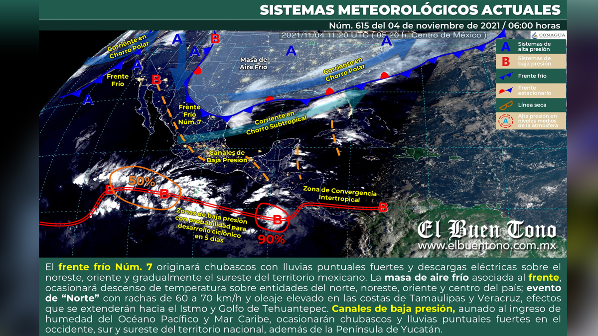 Este día, el frente frío Núm. 7 recorrerá el noreste, oriente y gradualmente el sureste del territorio mexicano, en su recorrido originará chubascos con lluvias puntuales fuertes, acompañadas de descargas eléctricas en dichas regiones. La masa de aire frío asociada al frente, ocasionará descenso de temperatura sobre entidades del norte, noreste, oriente y centro del país, así como evento de “Norte” con rachas de 60 a 70 km/h, además de oleaje elevado en las costas de Tamaulipas y Veracruz, efectos que se extenderán hacia el Istmo y Golfo de Tehuantepec. Por otra parte, canales de baja presión, aunado al ingreso de humedad del Océano Pacífico y Mar Caribe, ocasionarán chubascos y lluvias puntuales fuertes en el occidente, sur y sureste del territorio nacional, además de la Península de Yucatán.