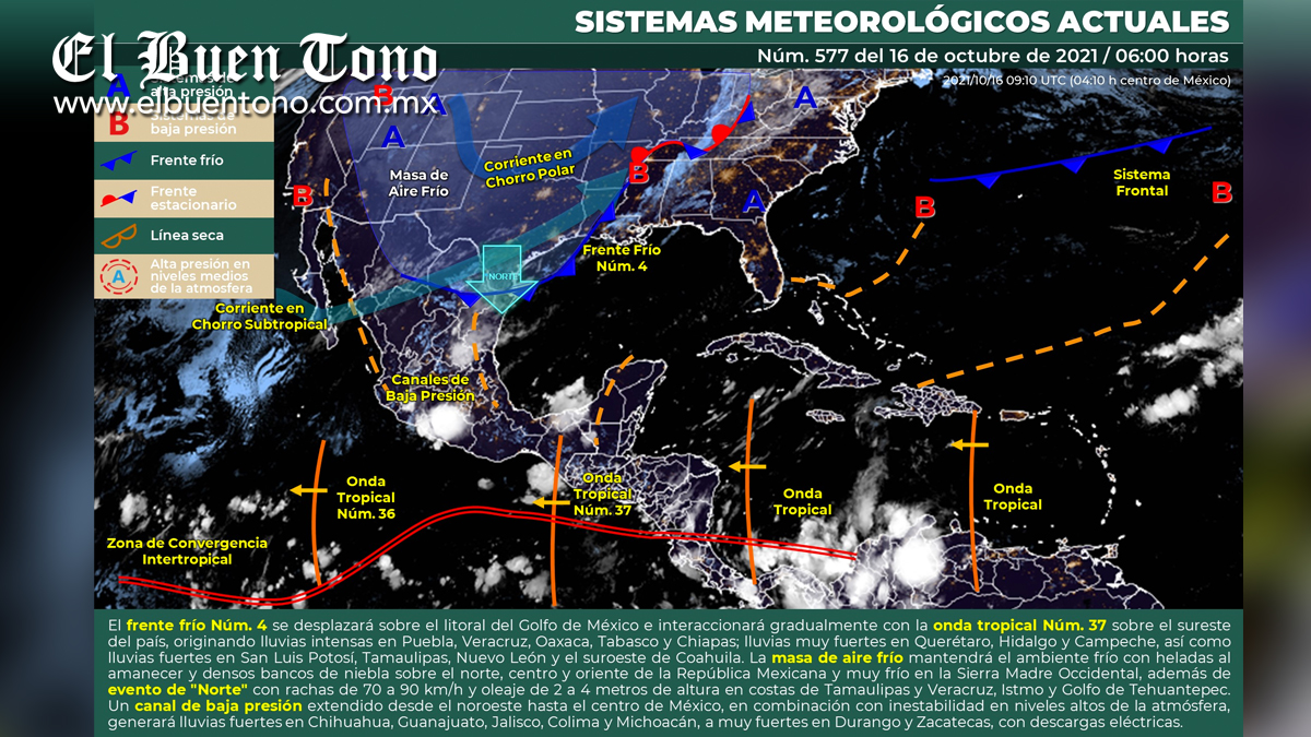 Para hoy, el frente frío Núm. 4 se desplazará sobre el litoral del Golfo de México e interaccionará gradualmente con la onda tropical Núm. 37 que se extenderá sobre el sureste del país, originando lluvias intensas en Puebla, Veracruz, Oaxaca, Tabasco y Chiapas, lluvias muy fuertes en Querétaro, Hidalgo y Campeche, así como lluvias fuertes en San Luis Potosí, Tamaulipas, Nuevo León y el suroeste de Coahuila. La masa de aire frío asociada al frente mantendrá el ambiente frío con heladas al amanecer y densos bancos de niebla sobre el norte, centro y oriente de la República Mexicana y muy frío en la Sierra Madre Occidental, además de evento de “Norte” con rachas de 70 a 90 km/h y oleaje de 2 a 4 metros de altura en las costas de Tamaulipas y Veracruz, Istmo y Golfo de Tehuantepec. Por otro lado, un canal de baja presión extendido desde el noroeste hasta el centro de México en combinación con inestabilidad en niveles altos de la atmósfera generará lluvias fuertes en Chihuahua, Guanajuato, Jalisco, Colima y Michoacán, a muy fuertes en Durango y Zacatecas, las cuales se acompañarán de descargas eléctricas.