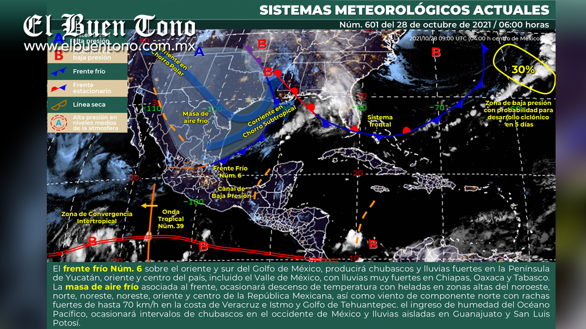 Para hoy, el frente frío Núm. 6 se extenderá sobre el oriente y sur del Golfo de México, produciendo chubascos y lluvias fuertes en la Península de Yucatán, oriente y centro del territorio nacional, incluido el Valle de México, con lluvias puntuales muy fuertes en Chiapas, Oaxaca y Tabasco. La masa de aire frío asociada al frente, ocasionará descenso de temperatura con heladas en zonas altas del noroeste, norte, noreste, oriente y centro de la República Mexicana, así como viento de componente norte con rachas fuertes de hasta 70 km/h en la costa de Veracruz e Istmo y Golfo de Tehuantepec, disminuyendo por la tarde. Por otra parte, el ingreso de humedad del Océano Pacífico, ocasionará intervalos de chubascos en el occidente de México y lluvias aisladas en Guanajuato y San Luis Potosí.