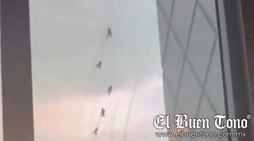 Los fuertes vientos fueron los responsables de que los trabajadores quedaran suspendidos de cuerdas, sin embargo, lograron descender de forma segura pese a la peligrosa situación.