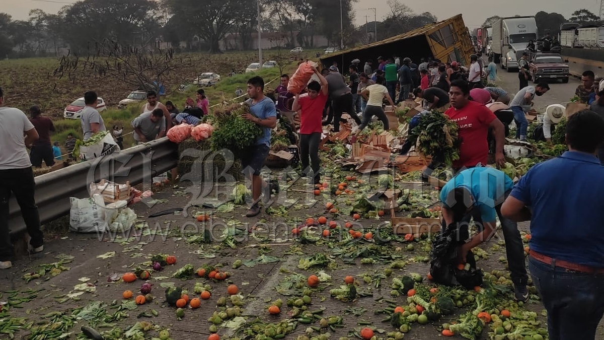 Córdoba,Ver.-El conductor de un tractocamión cargado con verdura, perdió la vida lamentablemente la tarde de este martes, luego de que volcara sobre la autopista Córdoba Veracruz a la altura del kilómetro 293. Su acompañante resultó gravemente herido el cual fue trasladado por paramédicos de Capufe a un hospital para su pronta atención médica. Tras los lamentables hechos decenas de ladrones arribaron al lugar para cargar con el producto que estaba regado sobre la carpeta de rodamiento
