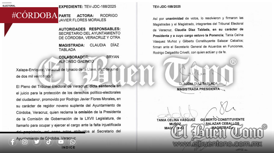 Córdoba.- El Tribunal Electoral de Veracruz (TEV) ventiló las omisiones y el trasfondo político que han imperado en el Ayuntamiento de Córdoba, al resolver el juicio TEV-JDC-188/2025, donde se reconoció que la Comisión de Gobernación del Congreso local y el propio gobierno municipal habían actuado con negligencia para evitar que Rodrigo Javier Flores Morales, regidor noveno suplente, asumiera el cargo tras el encarcelamiento del titular.