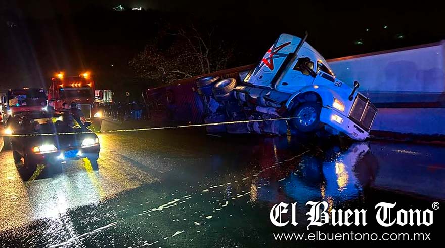 Nogales.- Un tractocamión acoplado a un remolque volcó la noche del sábado en la autopista Puebla-Orizaba, a la altura de la Laguna de Nogales.