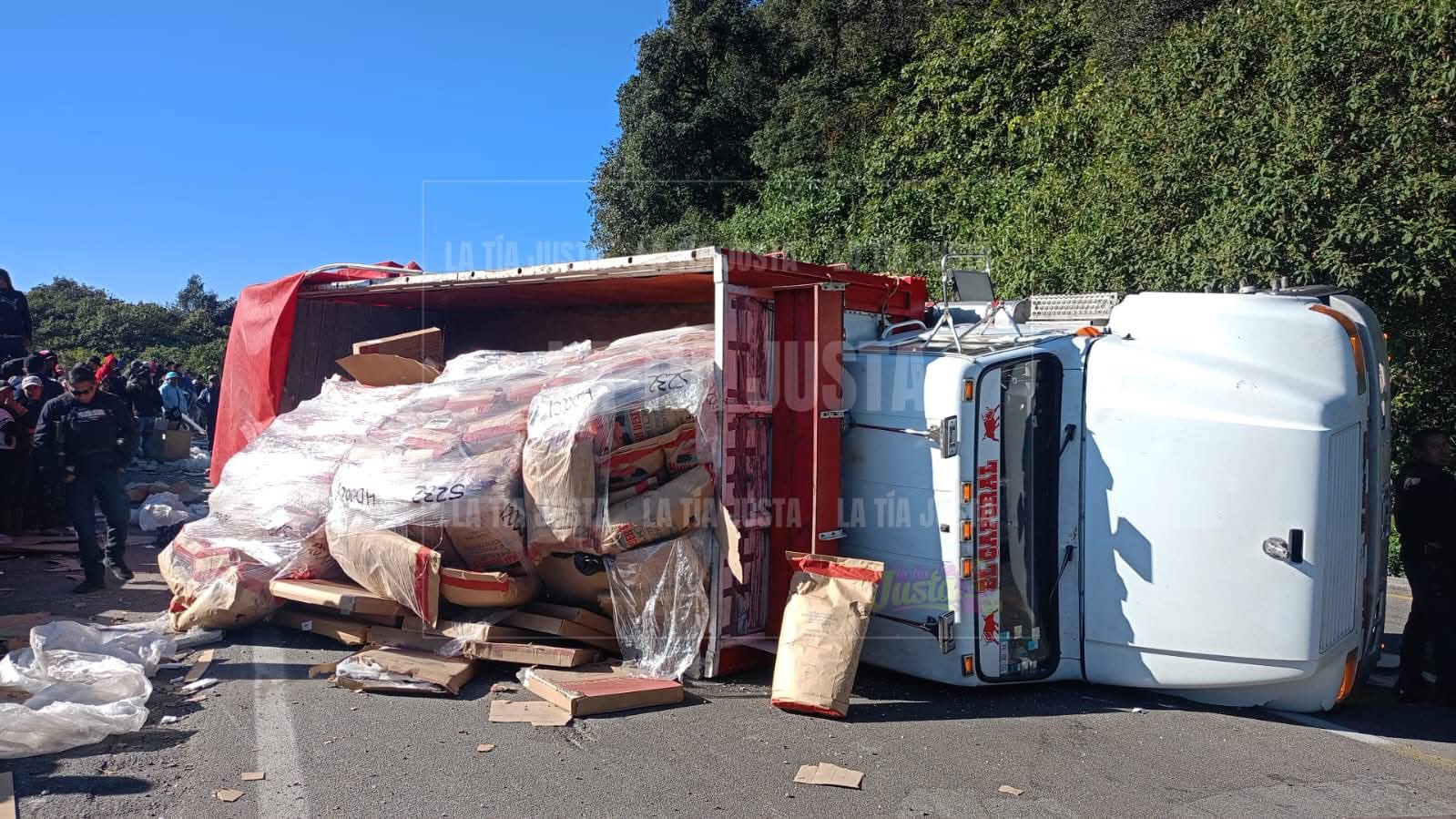 El accidente se registró la mañana de este día en el kilómetro 228 del tramo carretero Acatzingo–Ciudad Mendoza, con dirección al puerto de Veracruz, cuando el operador de un camión marca Dina International, color blanco, con caja de redilas rojas y cargado con bultos de alimento, perdió el control de la unidad presuntamente a causa de una falla mecánica, provocando que volcara sobre su costado derecho en el carril de baja velocidad.