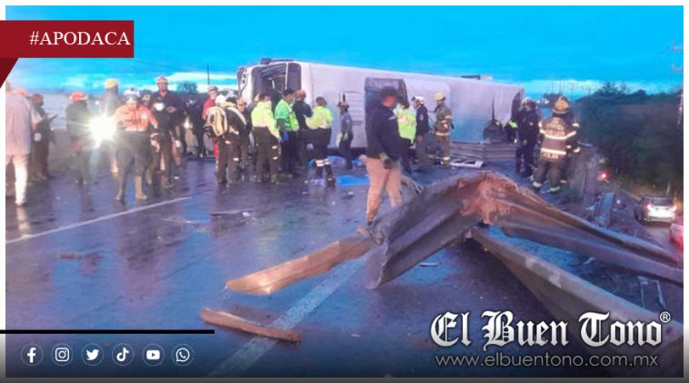 De acuerdo con información de Protección Civil del estado, el accidente ocurrió sobre el kilómetro 24 de la carretera Miguel Alemán, en los límites de Apodaca con Pesquería, cuando un camión de la ruta 611 Apodaca-Pesquería se despistó y terminó volcado.