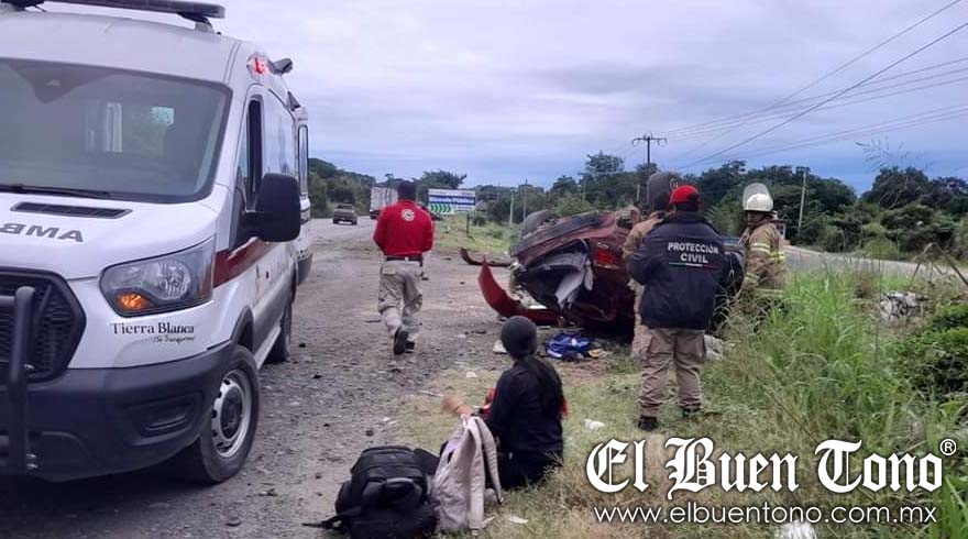 Tierra Blanca. – Tres personas que viajaban a bordo de un vehículo de la marca KIA resultaron lesionadas después de que la unidad volcara debido a que el conductor perdió el control, presumiblemente por exceso de velocidad, en el kilómetro 25+200 de la carretera federal Tinaja-Cd. Alemán, en el tramo Tierra Blanca del Amate.