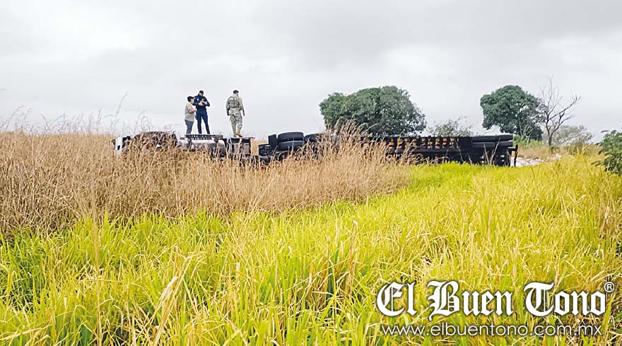 Cuitláhuac.- Un tráiler que transportaba cartón terminó volcado en un cañal cercano a la carretera federal Córdoba-Veracruz, a la altura de la localidad de La Quebradora.