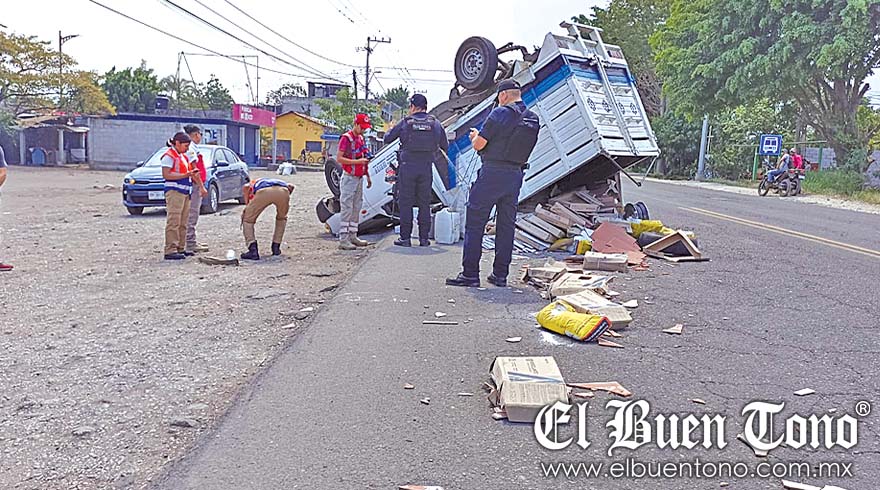 Yanga.- En un accidente vehicular registrado en la carretera federal Córdoba-Veracruz, a la altura de la localidad de Palmillas, una camioneta cargada de cajas con losetas volcó debido al exceso de velocidad, informaron las autoridades.