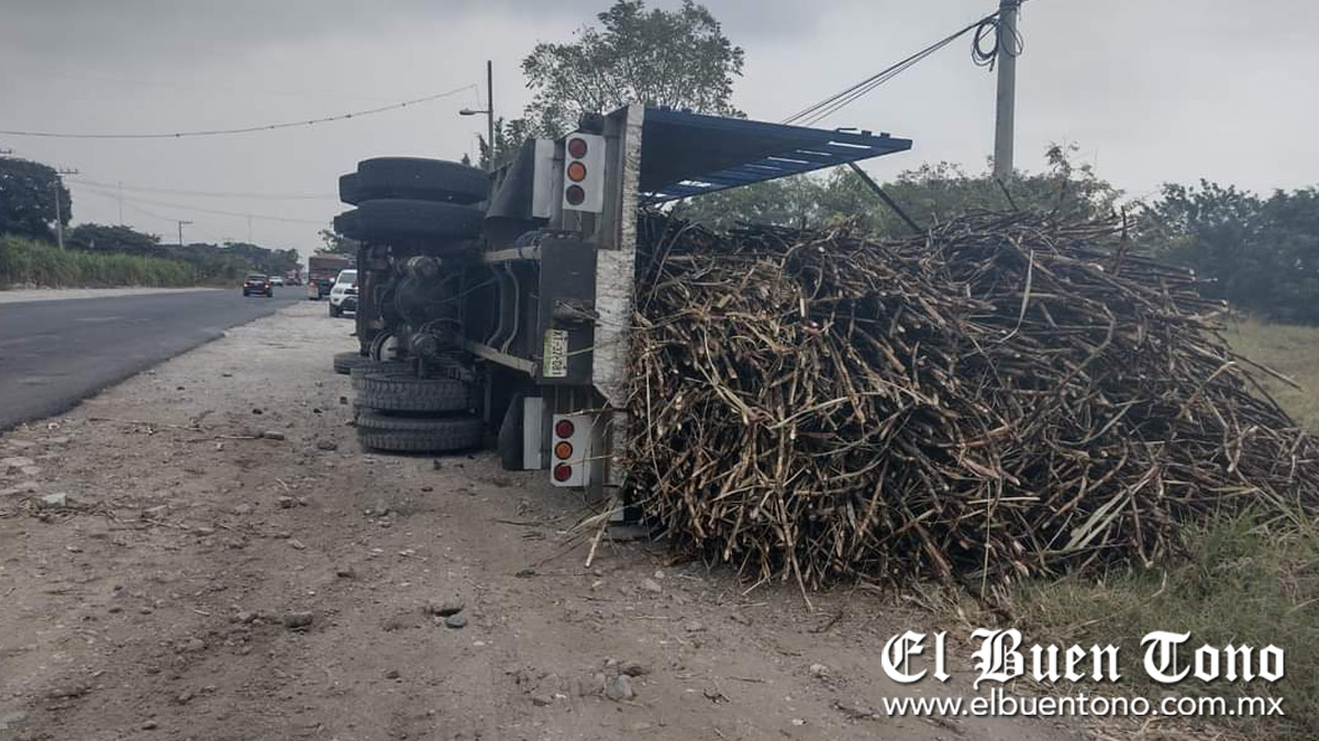 Cuitláhuac.- Un camión cañero volcó, la mañana de ayer domingo, luego de esquivar a un motociclista que había derrapado luego de atropellar a un perro, el cual se le atravesó, provocando que el camión cañero quedará volcado a un costado de la carpeta asfáltica y el perro sin vida.