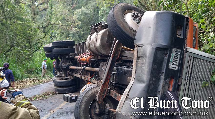 COSCOMATEPEC.- La volcadura de un camión cañero se registró la mañana de ayer en la carretera federal Fortín-Conejos, específicamente en la barranca del Río Jamapa. Como resultado, la circulación se vio afectada y quedó reducida a un carril, requiriendo la intervención de los servicios de emergencia para abanderar la zona.
