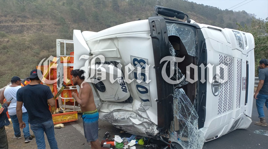 Maltrata, Ver.- Un camión cargado con pollos volcó en su lateral derecho al conducir con exceso de velocidad, por lo que orilló a los rateros a llevarse la mercancía sin que nadie se los impidiera.