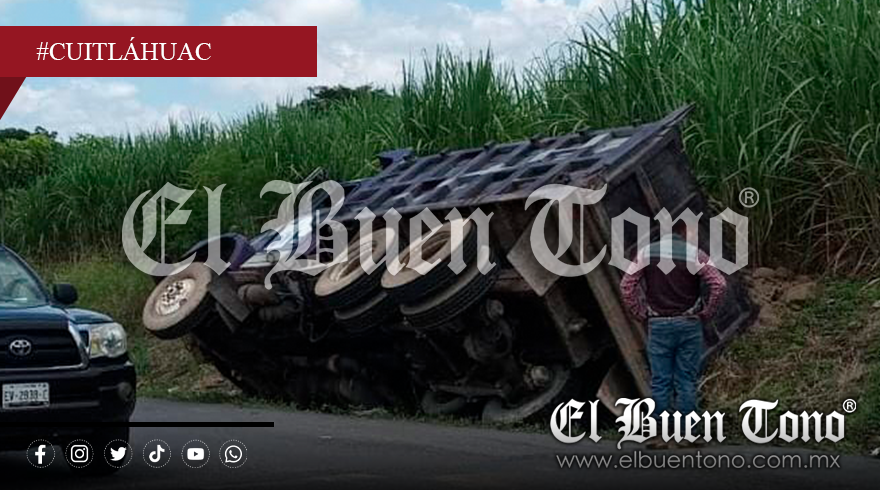 Cuitláhuac, Ver.- La tarde de este lunes, un camión tipo volteo que transportaba balastro volcó a un costado de la carretera Yanga-Omealca, justo frente al corralón del ingenio de San José de Abajo.