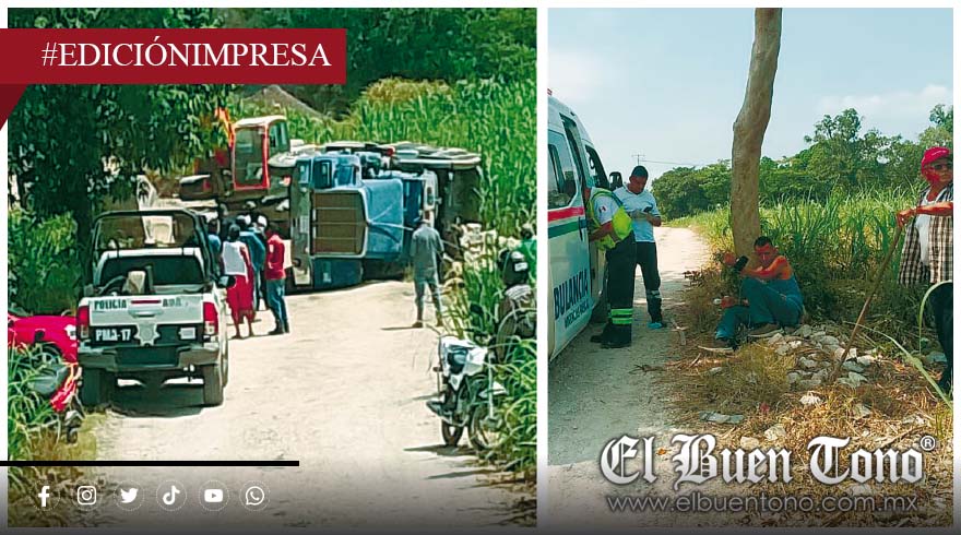 Al circular por un camino de terracería, la unidad avanzó cerca de un desnivel y el peso provocó que se fuera de lado y terminara volcado.