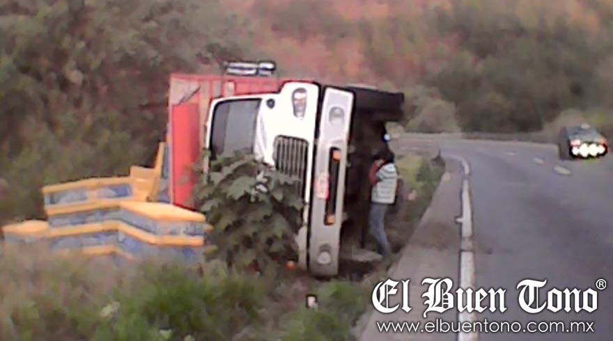 El suceso tuvo lugar la mañana de ayer en el kilómetro 242 de la autopista mencionada, en los carriles con dirección al estado poblano, cuando al conductor del camión le venció el peso después de una curva, lo que provocó que la unidad quedara llantas de lado a un costado de la carretera.