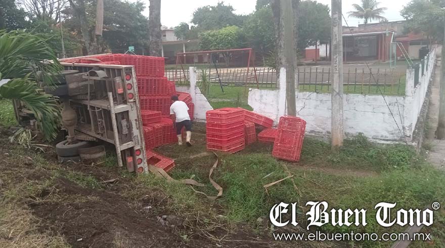 AMATLÁN.- Un camión tipo plataforma que transportaba rejas vacías de plástico, volcó a un costado de la carretera federal Córdoba-Veracruz, a la altura de Venta Parada.