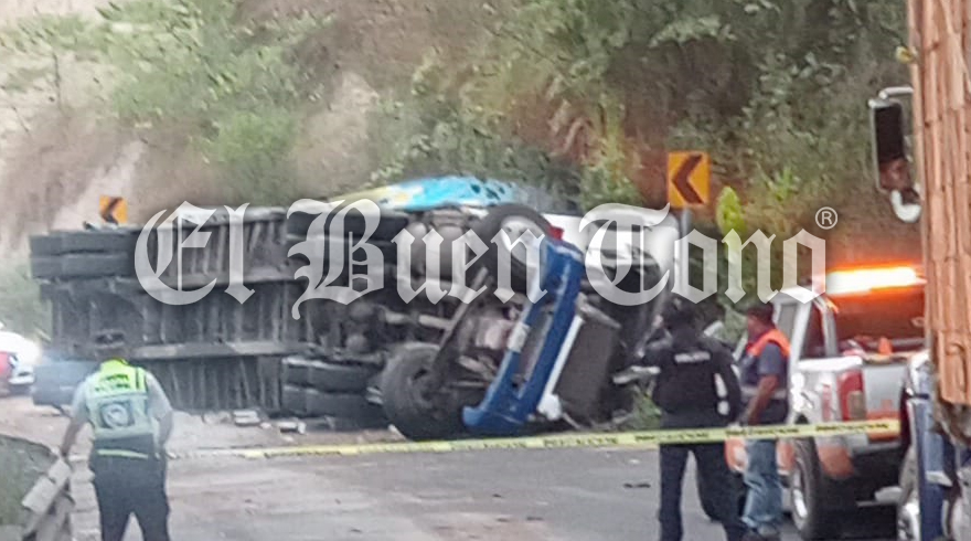 Chocamán, Ver.- Un camión repartidor de refrescos se volcó la madrugada de este martes en la carretera federal a Xalapa, la altura de la barranca, quedando su conductor, prensado y lesionado.