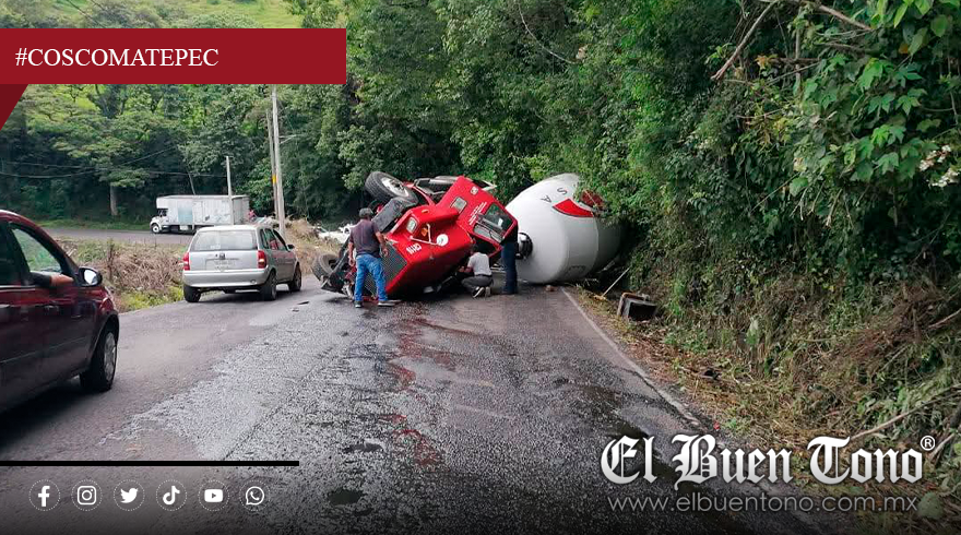 Coscomatepec, Ver.— La tarde de este miércoles, un camión revolvedora de concreto volcó sobre la carretera federal Coscomatepec-Huatusco, a la altura de la barranca del río Jamapa.