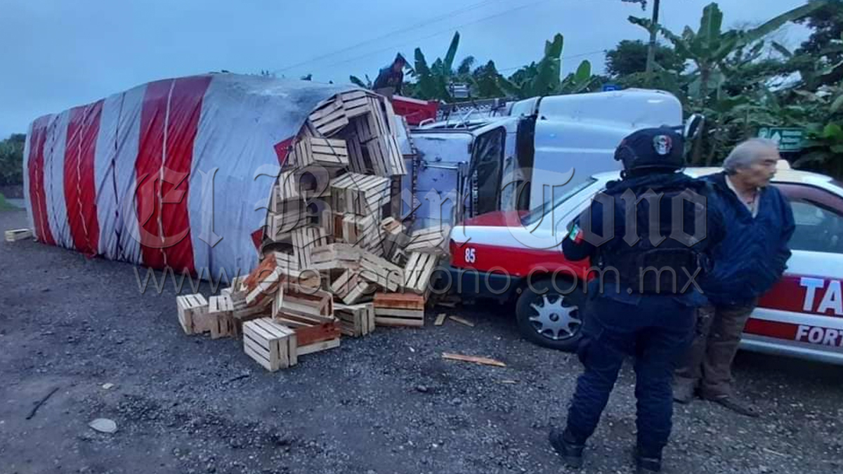 Fortín.- Un camión tipo Torton cargado con cajas de madera, terminó volcado la mañana de este viernes, luego de que su conductor perdiera el control al momento de circular sobre la carretera federal Fortin-Huatusco, a la altura del centro de verificación en la colonia Gardenias, lo cual provocó la movilización de los grupos de auxilio así como de las corporaciones policíacas sin que el accidente dejara personas lesionadas únicamente daños materiales.