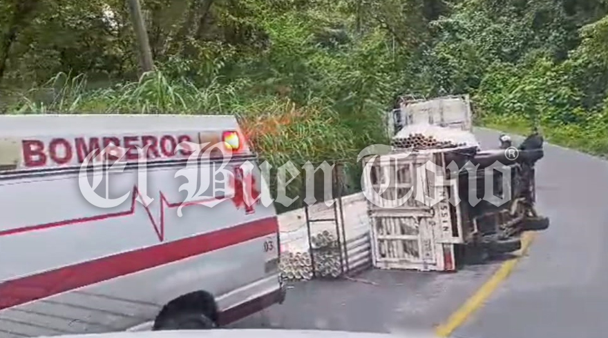 Coscomatepec, Ver.- Una camioneta que transportaba tubos de PVC se volcó durante la mañana de este martes en la carretera federal Coscomatepec-Huatusco, a la altura de la barranca de Jamapa.
