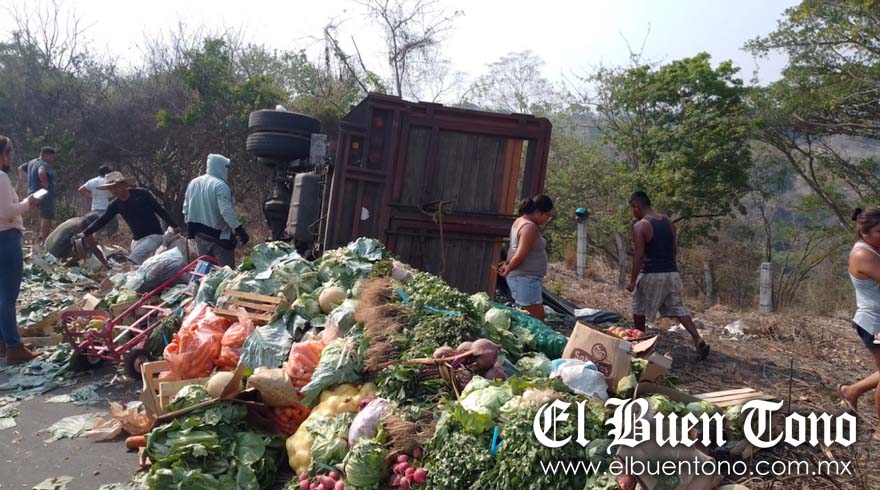 Fue a la altura del kilómetro 53+500, de la carretera federal Cuitláhuac-La Tinaja, cuando el conductor de la camioneta Chevrolet Silverado, de tres toneladas, perdió el control del volante, quedando la unidad volcada y su cargamento regado sobre la cinta asfáltica.