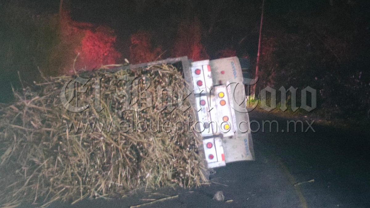 Ixtaczoquitlán.- Un camión cañero que circulaba sobre la carretera federal Ixtaczoquitlán-Fortín, volcó de forma aparatosa luego de que al conductor le venció el peso de la carga y acabó siniestrado a la altura del tramo carretero conocido como “la Curva de la Herradura”, ubicado en la localidad de Cuautlapan.